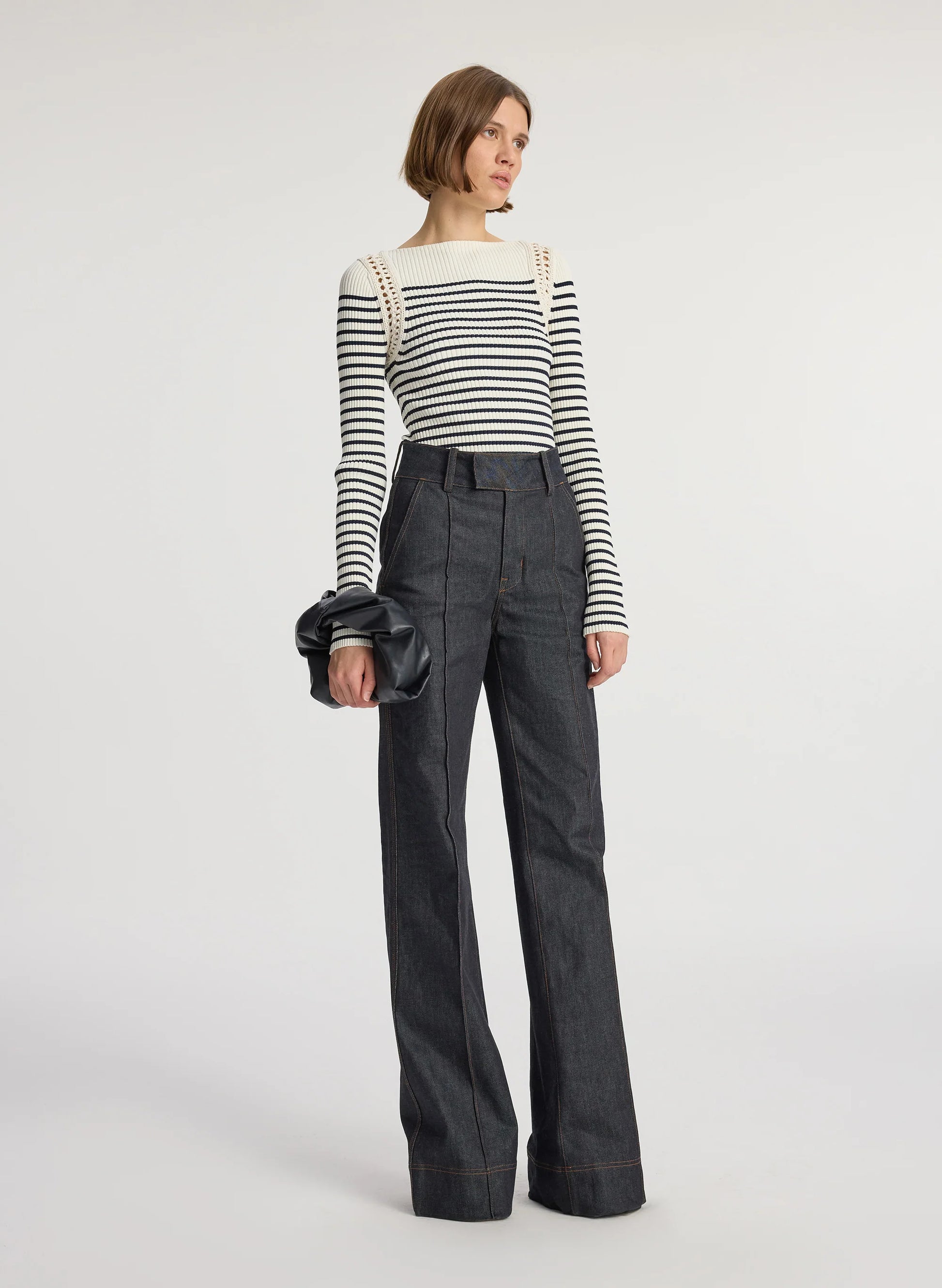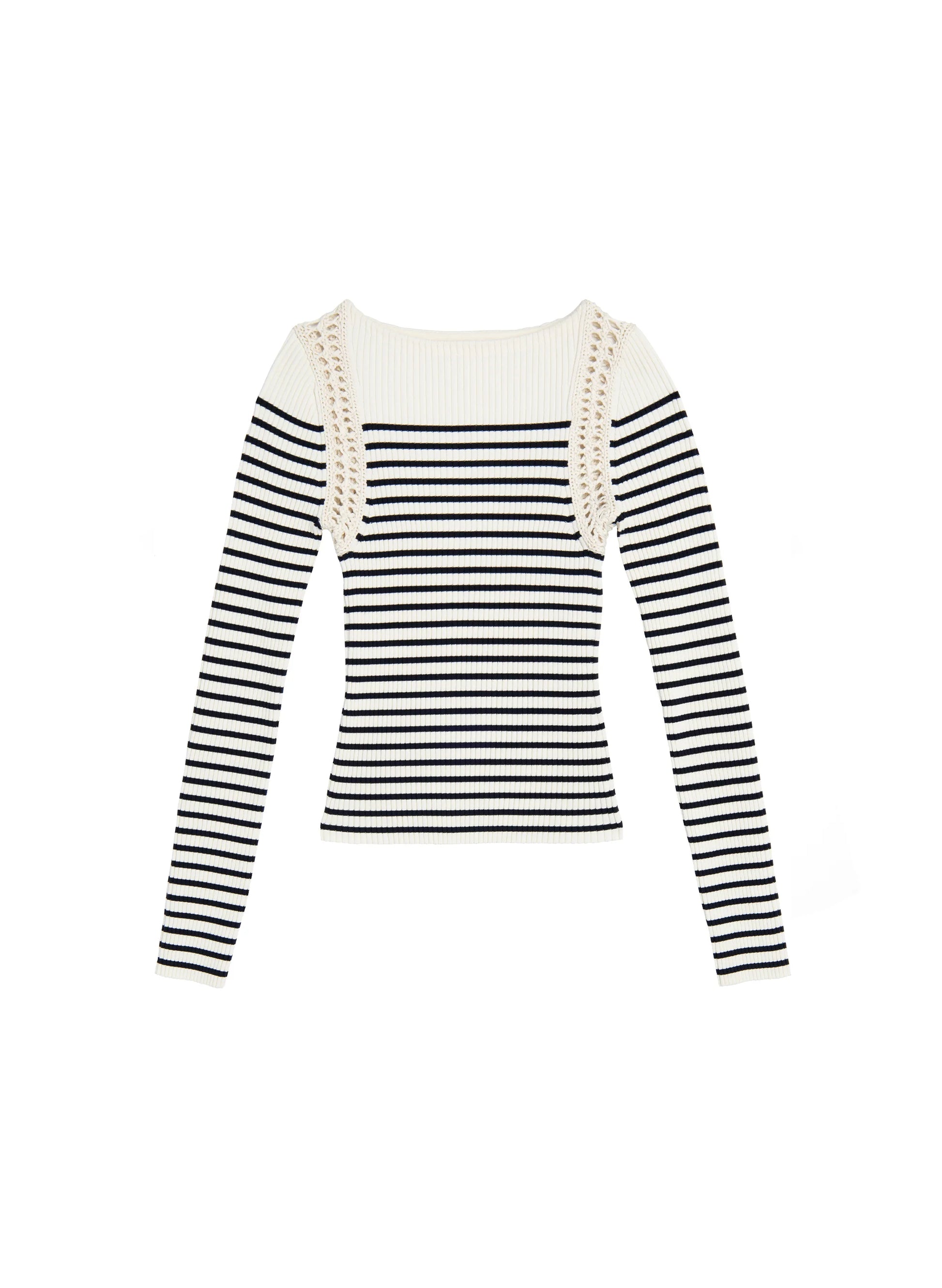 The Isa Top is knitted from a dry rayon viscose yarn in a navy and bone-white striped motif. This fitted silhouette is ribbed and features hand-crocheted detailing along the shoulders. a bateau neckline. and slim. long sleeves. Shop Tops